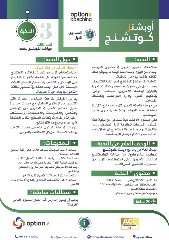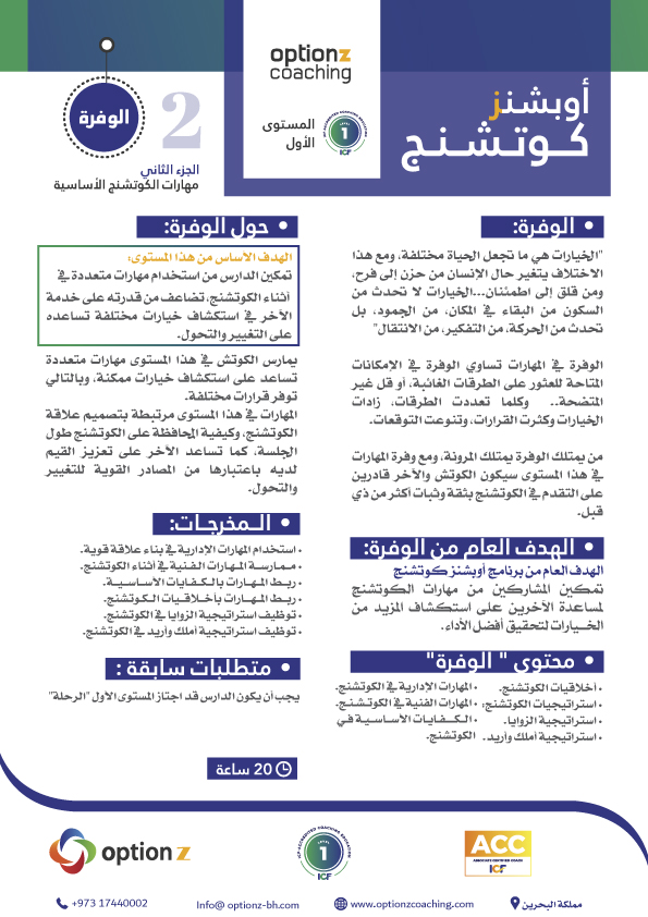 Coaches at this part practice multiple skills that help to explore possible options and thus provide different decisions. The skills at this level are related to the design of the coaching relationship, and how to maintain the coaching throughout the session, as well as help the other to reinforce his values as they are powerful sources of change and transformation.